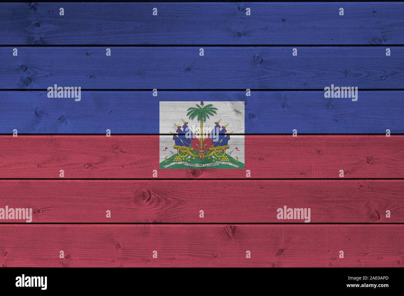 Haiti Flag Depicted In Bright Paint Colors On Old Wooden